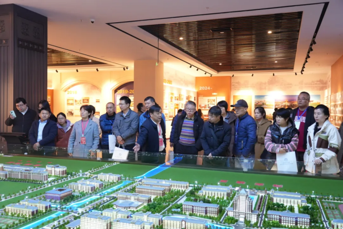 会后,海洋之神hy590科技集团董事长张福德、总经理唐佩随队和与会人员一起参观了南通理工学院的数智展馆、张謇教育文化馆等地并合影留念。